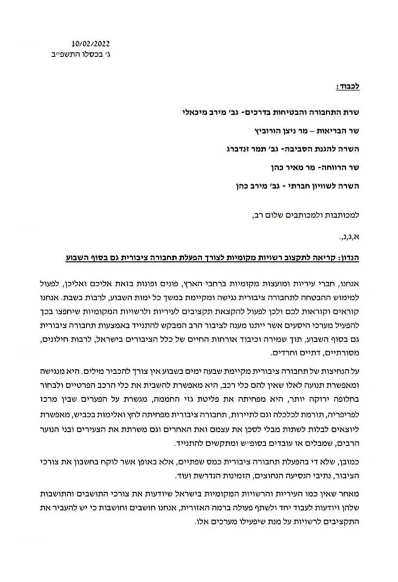 במכתב קוראים חברי המועצה להעברת תקציב לרשויות המקומיות שיאפשר להקים מערך תחבורה ציבורית 7 ימים בשבוע וינגיש אותו לתושבים ללא רכבים. לדבריהם הדבר מהווה תרומה ירוקה בכך שמוריד רכבים מהכבישים ומסייע לתיירות והקישור בין הפריפריה למרכז.