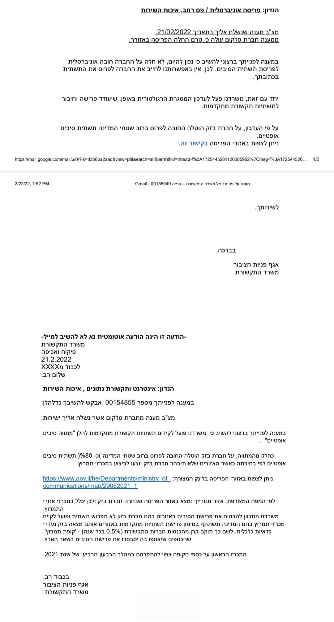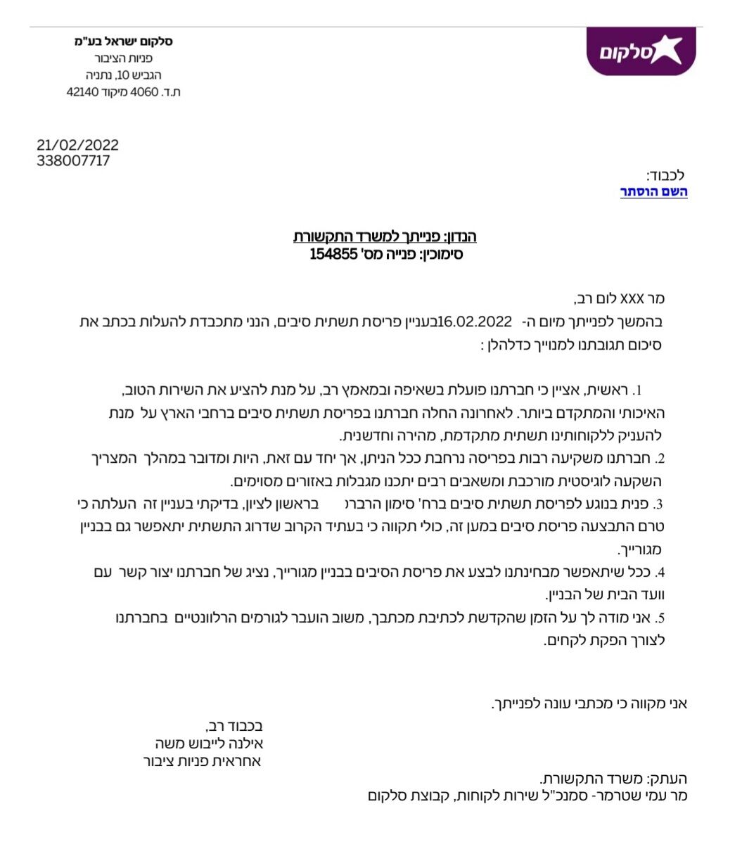 תגובות חברת סלקום ומשרד התקשורת לתושבים