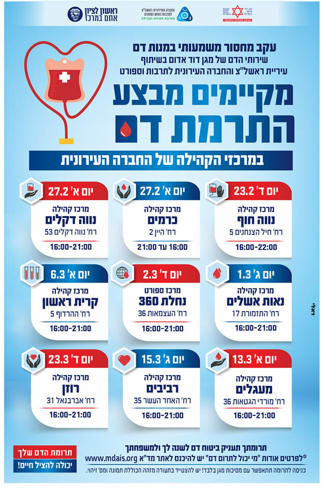 במהלך השבועות הקרובים תקיים עיריית ראשון לציון בשיתוף מד"א מבצעי התרמות דם במרכזי הקהילה, לאור המחסור החמור במנות דם בישראל