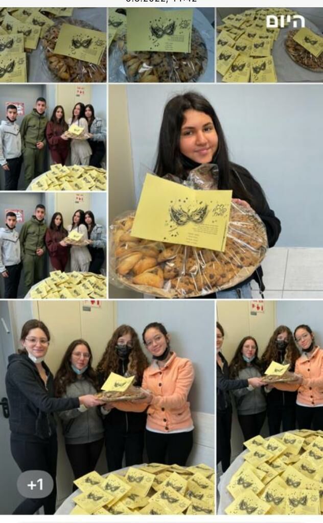 נציגי שכבת כיתות ט' יחד עם רכזת השכבה- חדוה לוי הגיעו למועדון לשמח את הקשישים בשירים , אביזרי פורים, מוזיקה ומאפים אשר נאפו על ידי התלמידים אשר נפגשו בשעות אחה״צ לסדנת אפייה.