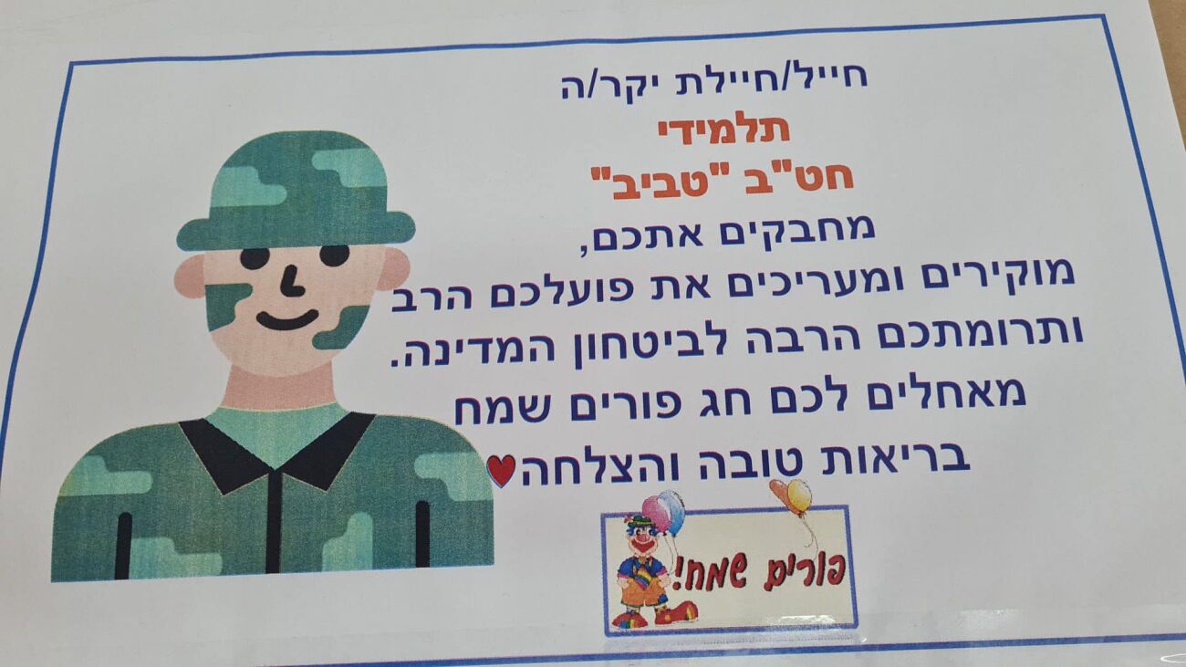 בנוסף התקיימה פעילות קהילתית נוספת למען חיילים. לקראת חג פורים תלמידי "טביב" הכינו עשרות חבילות של משלוח מנות שיחולקו לחיילים בודדים בעיר.