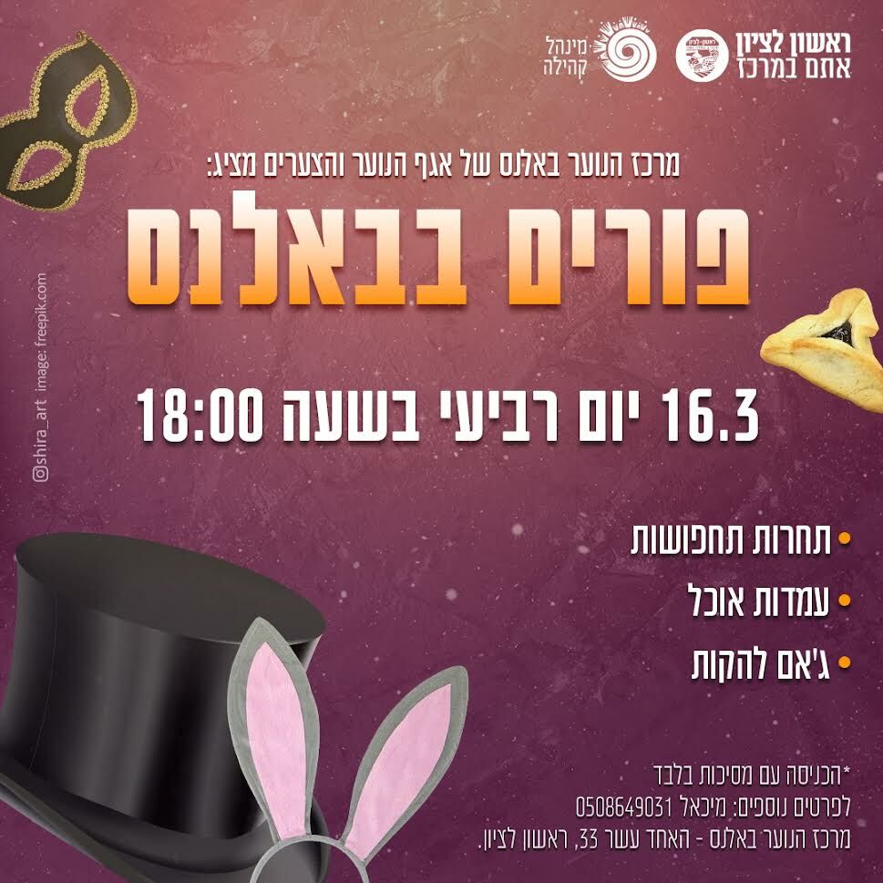 מדריך אירועי פורים ליום רביעי 16.3 בראשון לציון: מה קשור, אלי ומריאנו, להטוטנים, סדנאות תיפוף, קריאת מגילה, פורימון תנועות הנוער ועוד