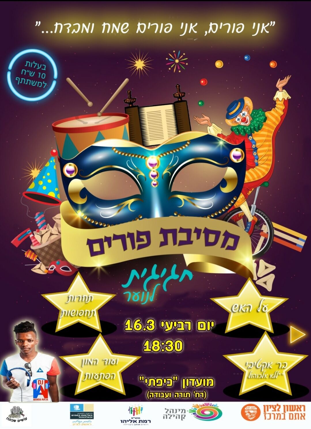 מסיבת פורים עם הזמר שלמה לוגסי, ליצנים ופעילות.