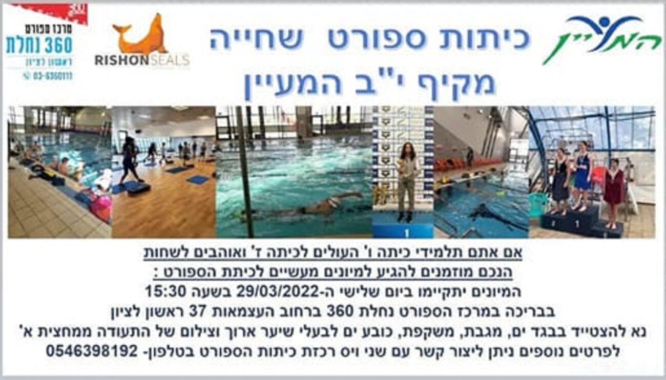 מחר (שלישי 29.3) יתקיים במרכז 360 נחלת יום מיונים לכיתת ספורט- שחייה של מקיף י"ב המעיין בראשון לציון