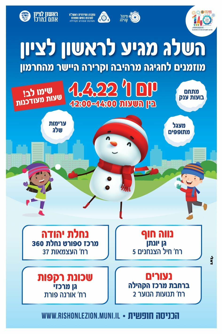 עיריית ראשון לציון מביאה את החרמון לילדי העיר בהפנינג מושלג שיתקיים בארבעה מוקדים ברחבי העיר. ביום שישי תתקיים חגיגה לבנה לילדים עם שלג מהחרמון, מעגלי מתופפים ומתחם בועות ענק.