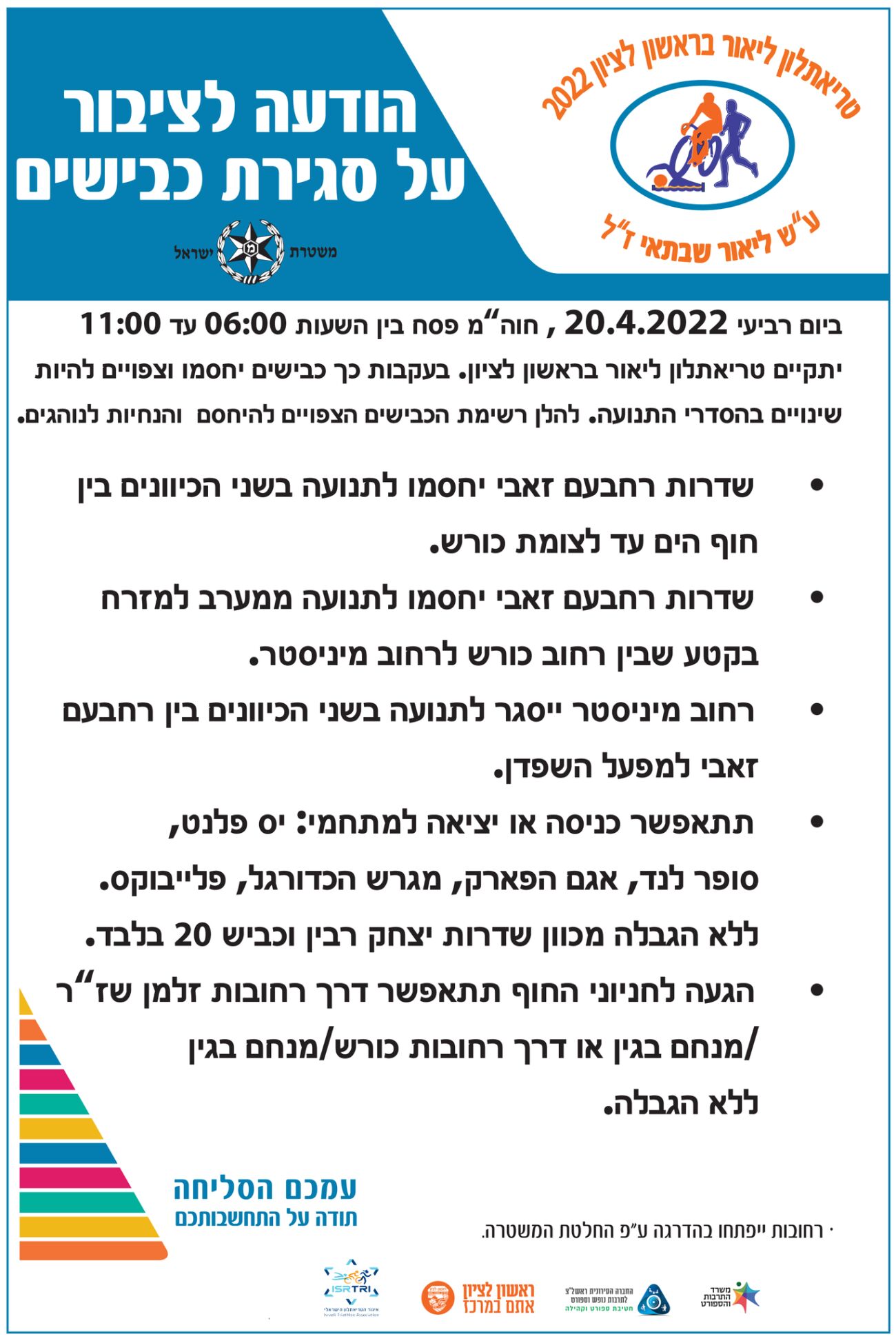 ביום רביעי 20.4 ייצא לדרך אירוע הטריאתלון ע"ש ליאור שבתאי ז"ל בראשון לציון. האירוע יתקיים בין השעות 6:00 ועד 11:00 אשר יביאו לסגירות כבישים ושינויים בהסדרי התנועה במערב העיר.