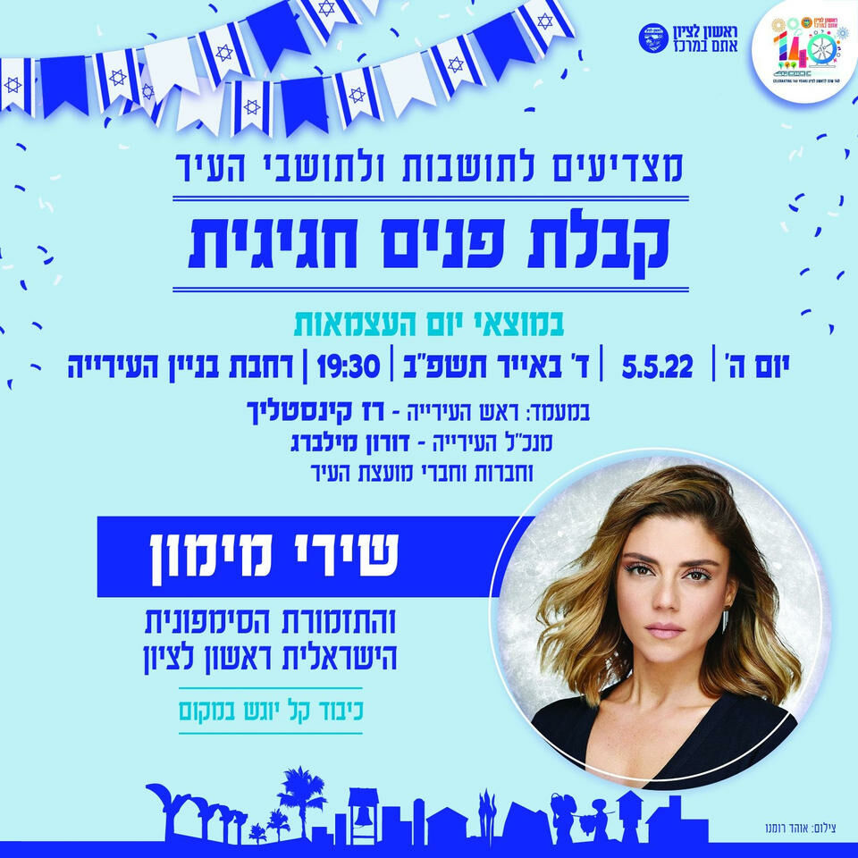 מדריך אירועי יום העצמאות 2022 בראשון לציון! 7 במות עם אלה לי, מוש בן ארי, הראל מויאל, שירי מימון, מסע האופניים, הרקדה בטיילת, הפנינג משחקים בחוף הים ובכפר הקסום, קבלת הפנים המסורתית, הנפת הדגל במוזיאון ראשון לציון ועוד- הפרטים המלאים בכתבה