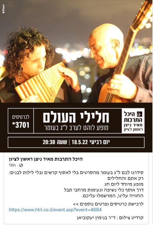 ביום רביעי 18.5 יתקיים בהיכל התרבות ראשון לציון, מופע "חלילי העולם", מסע מוזיקלי בין תרבויות דרך אוסף כלי נשיפה ונעימות מרחבי תבל- מצ"ב סרטון