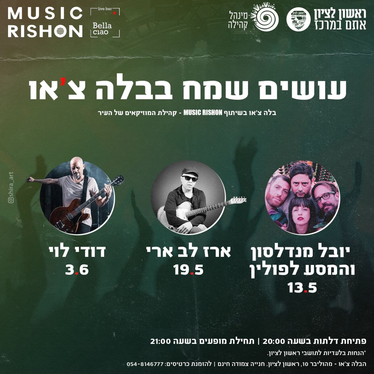 מיזם מיוזיק ראשון בשיתוף הפאב הבלה צ'או בעיר ממשיכים להנגיש תרבות מוזיקלית עבור תושבי העיר והפעם בעושים שמח בבלה צ'או. אחרי הופעות של יובל מנדלסון (שייגעצ) והמסע לפולין בשבועות הקרובים יהנו תושבי העיר מהופעות של ארז לב ארי ודודי לוי במופעים מיוחדים ומוזלים.