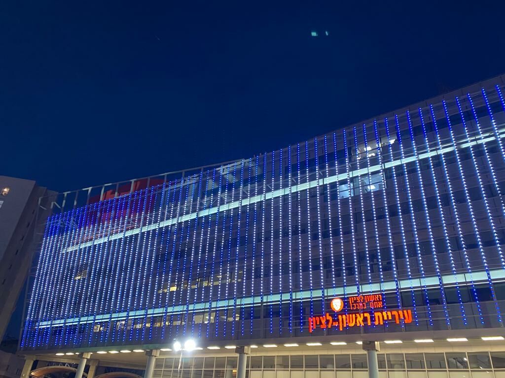 לרגל יום ירושלים החל היום, בניין עיריית ראשון לציון הואר הערב (ראשון) בצבעי דגל המדינה.