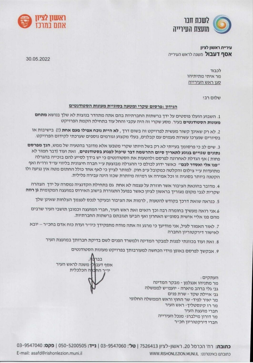 המשנה לראש העיר, אסף דעבול המשמש כמ"מ יו"ר החברה הכלכלית (האחראית על פרוייקט המעונות) שלח אמש מכתב חריף לסגן ראש העיר, ומחזיק תיק הנוער וצעירים, איתי מתיתיהו, בנושא פרסום שקרי ומטעי שלטענתו הוא מפיץ בימים אלו ברשתות החברתיות.