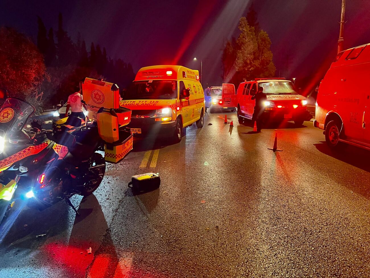 "מדובר בתאונת דרכים קשה מאוד. במקום הייתה המולה רבה. אחד מהפצועים שהיה מחוסר הכרה וסבל מפגיעה רב מערכתית קשה מאוד שכב סמוך לעצים מעבר לגדר ההפרדה. ביצענו בדיקות רפואיות אבל הוא היה ללא סימני חיים ולא נותר לנו אלא לקבוע את מותו. 3 פצועים נוספים באורח קל, בהם 2 הולכי רגל ונוסע מהרכב שהיה מעורב בתאונה טופלו במקום ופונו באמבולנסים של מד"א לבית החולים שמיר הסמוך כשמצבם יציב."