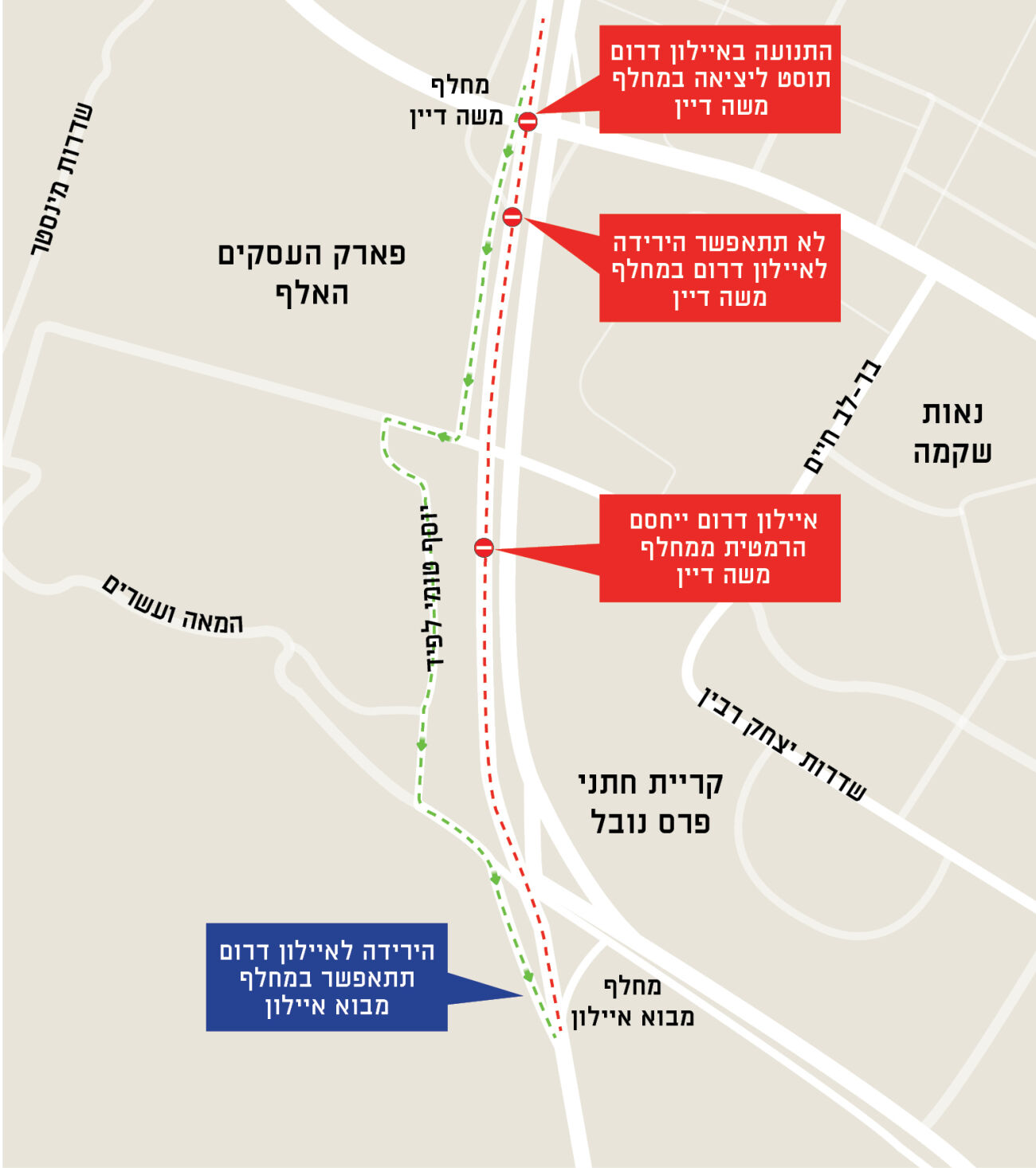 בשעות אלו, איילון דרום ייחסם הרמטית, ממחלף משה דיין ועד מבוא איילון, ולא תתאפשר הירידה למחלף משה דיין.