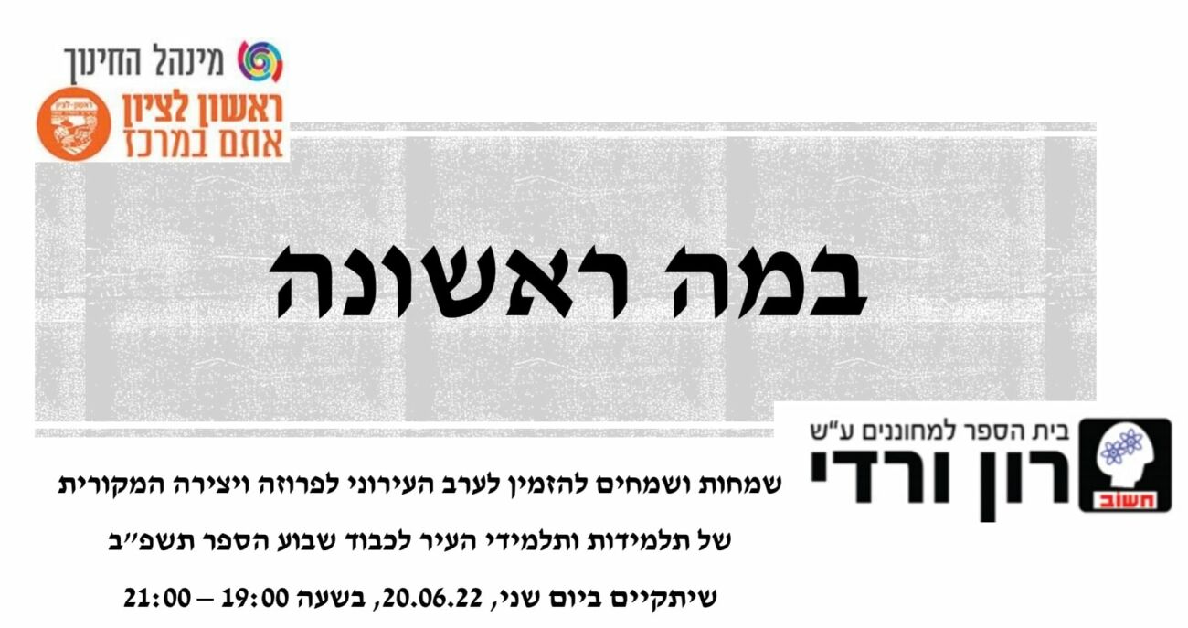 ביום שני 20.6 יתקיים במרכז שוורץ רייסמן לחינוך מדעי בראשון לציון אירוע במה ראשונה - ערב פרוזה ויצירה מקורית של בני הנוער בעיר