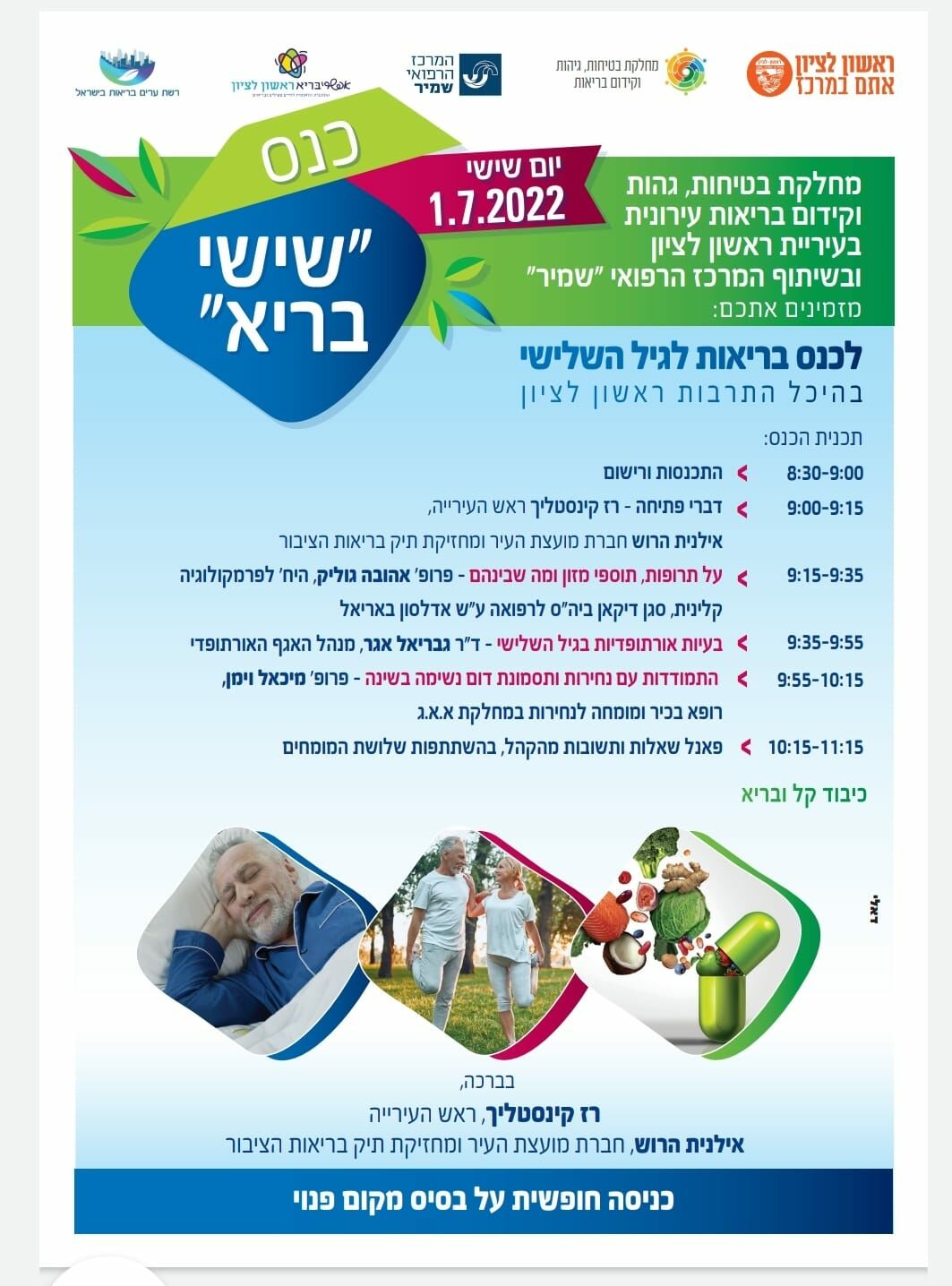 כחלק מקידום אורח חיים בריא ביום שישי 1.7 יתקיים כנס "שישי בריא" בהיכל התרבות ראשון לציון בנושא תרופות ותוספי מזון, בעיות אורתופדיות בגיל השלישי והתמודדות עם נחירות