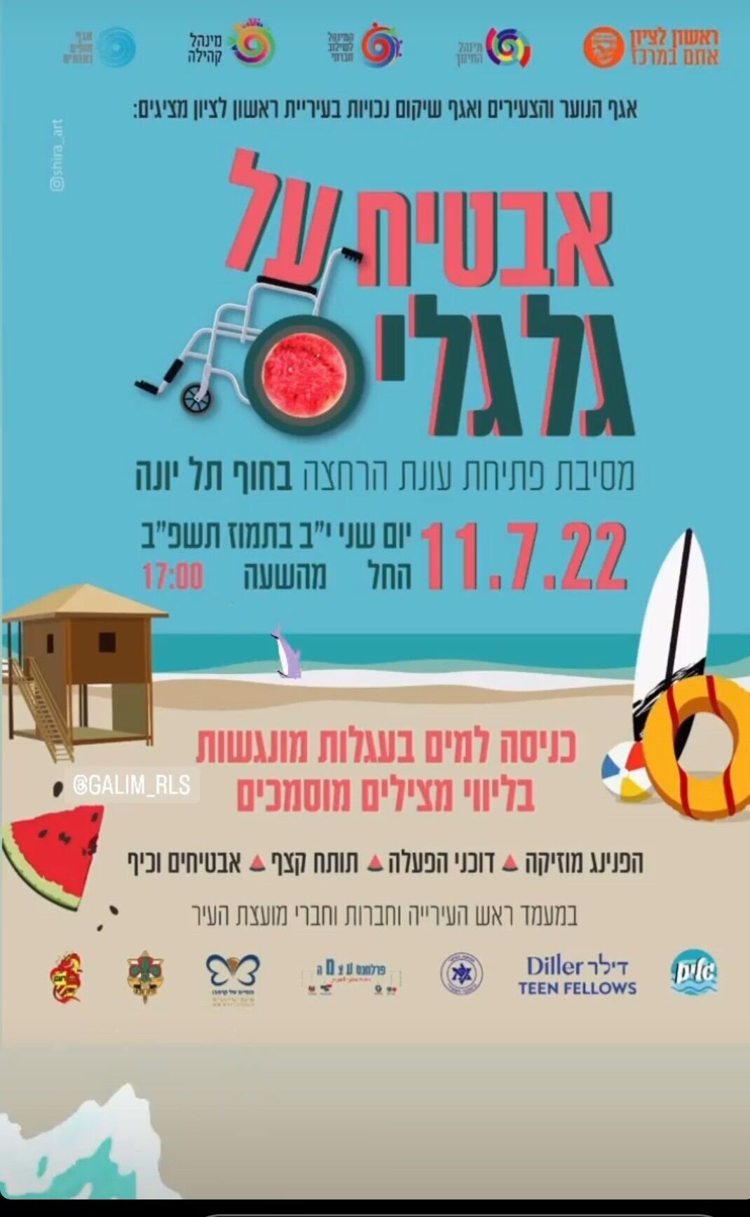 עיריית ראשון לציון: מינהל לשילוב חברתי, אגף הנוער במינהל קהילה ואגף חוף הים וצעירים יחנכו כמדי שנה את מיזם אבטיח על גלגלים המתקיים במטרה לסייע להנגיש את החוף לבעלי המוגבלות. המיזם נולד בעקבות מפגש משותף שנעשה עם הורים לילדים עם מוגבלות. אנשי המקצוע בעירייה שמעו את הצרכים ופיתחו את השירות בהתאם. את המיזם מובילים מינהל קהילה- אגף נוער וצעירים, אגף לשיקום נכויות במינהל הרווחה, אגף חופים ואגמים ,מנהל החינוך, בני נוער מעמיתי "דילר", ארגון הנוער "כנפיים של קרמבו", תנועות הנוער "מכבי צעיר" ו"הצופים", פרלמנט הנוער, פרלמנט הילדים, וכמובן מרכז הנוער ותחום ימי "גלים".