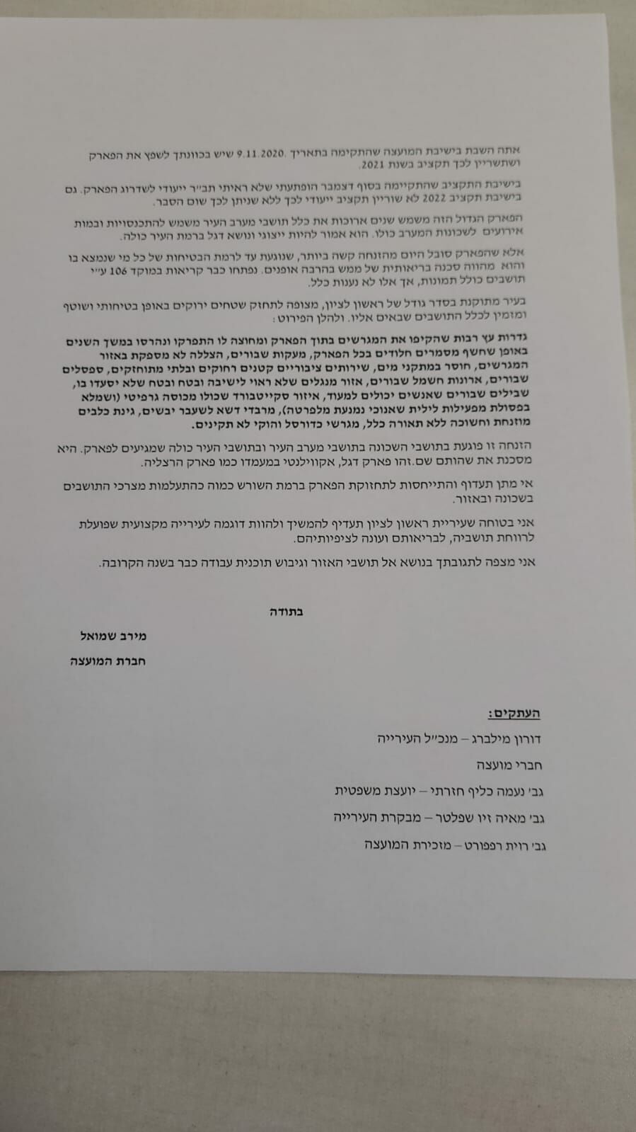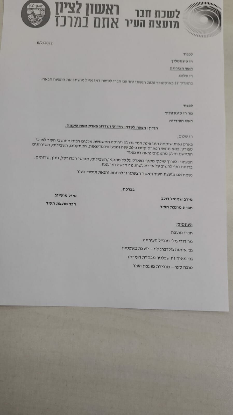בישיבה החל דיון בנושא ביחד עם מנכ"ל העירייה, דורון מילברג שאף יצא לאחרונה לסיור בשכונה ובפארק יחד עם חברת המועצה, מירב שמואלי דולב.