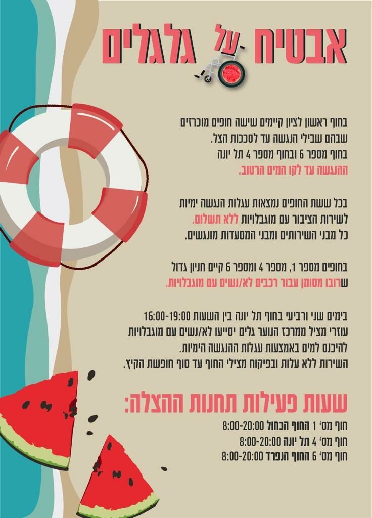 בימי שני ורביעי בחוף תל יונה בין השעות 16:00 ועד 19:00 עוזרי מציל ממרכז הנוער גלים יסייעו לאנשים עם מוגבלויות להיכנס לים באמצעות עגלות ההנגשה הימיות.