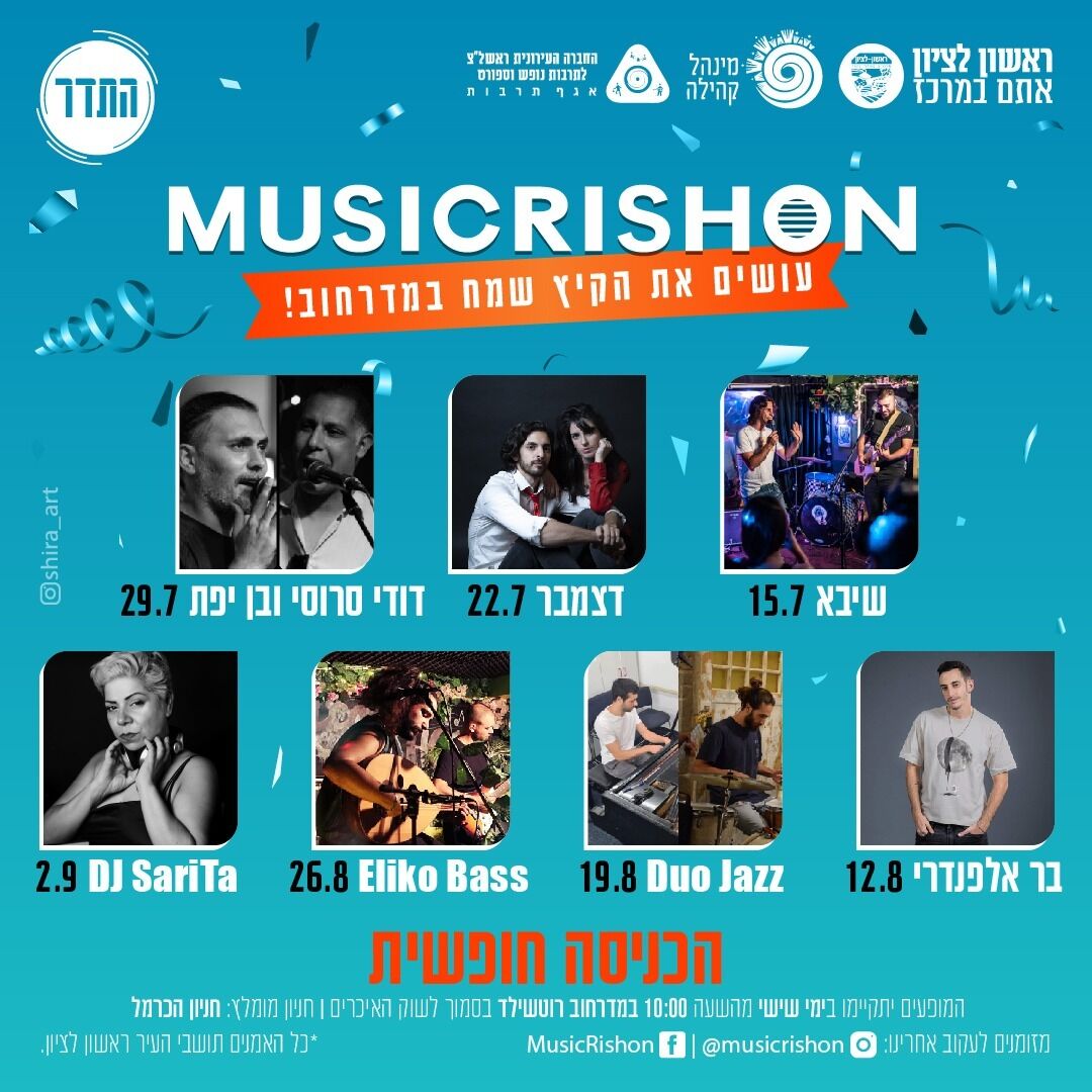 מופעי הרחוב של מיזם ראשון מיוזיק חוזרים למדרחוב רוטשילד. החל מיום שישי הקרוב 15.7 ולאורך עונת הקיץ יוכלו התושבים ליהנות ממופעים של אמנים מקומיים. המיזם מתקיים על ידי מיוזיק ראשון קהילת המוזיקאים של אגף הנוער והצעירים מינהל קהילה והחברה העירונית אגף תרבות המופעים יתחילו בסביבות השעה 10:00 לרחבת הציבור הכניסה חופשית.