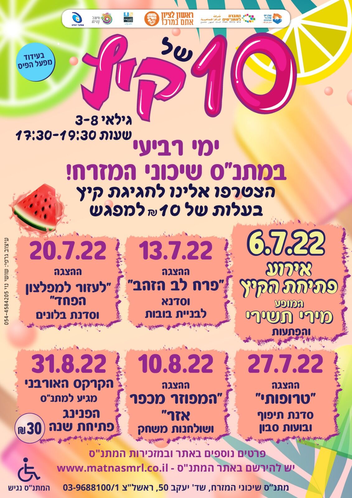 מתנ"ס שיכוני המזרח מזמין את התושבים לאירועי קיץ קסומים לילדים שיתקיימו בימי רביעי בין השעות 17:30-19:30 בחצר המתנ"ס. בתוכנית: המופע של מירי תשירי המופלא, הצגות ילדים מרגשות, סדנאות יצירה מהנות והכל ב-10 ש"ח בלבד.