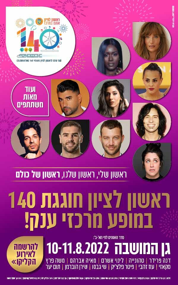 ראשון לציון חוגגת 140! בימים רביעי וחמישי 10-11/8 יפתחו בגן המושבה חגיגות יום ההולדת של העיר עם מופעים של משה פרץ, שי גבסו, תום יער, עוז זהבי, סקאזי, דנה פרידר, המדליסטים לינוי אשרם ופיטר פלצ'יק, מאיה אברהם, טהוניה, שירן הוברמן ועוד הפתעות לאורך כל השנה
