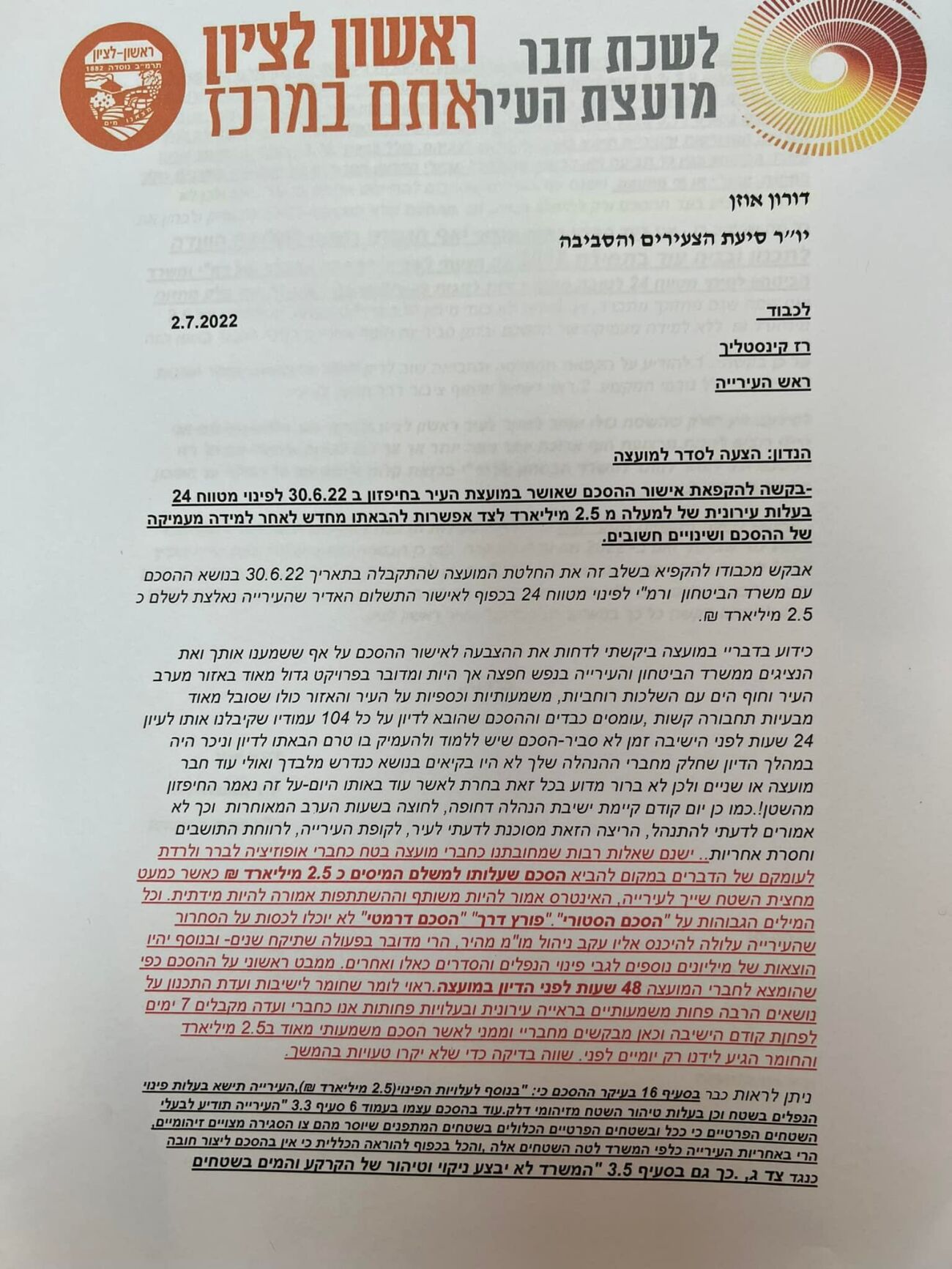 ההצעה לסדר תעלה מחר (רביעי 3.8) בישיבת המועצה