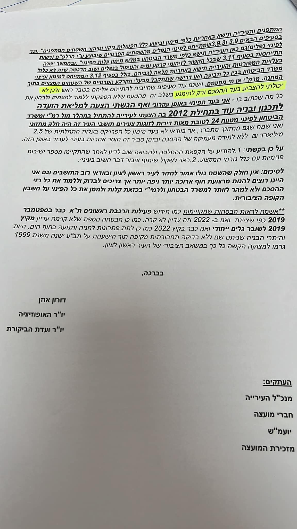 יו"ר האופוזיציה, דורון אוזן הגיש הצעה לסדר המבקשת להקפיא את אישור ההסכם לפינוי השטח הצבאי במטווח 24.