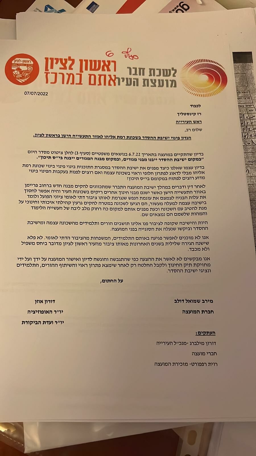דורון אוזן ומירב שמואלי דולב מבקשים להשהות את אישור ההחלטה לפינוי ישיבת ההסדר ברמת אליהו עד למציאת פיתרון המוסכם על ההורים וצוות הישיבה; עיריית ראשון לציון: "ישיבת ההסדר בשכונה לא תפונה בטרם תמצא חלופה ראויה לבנייה"