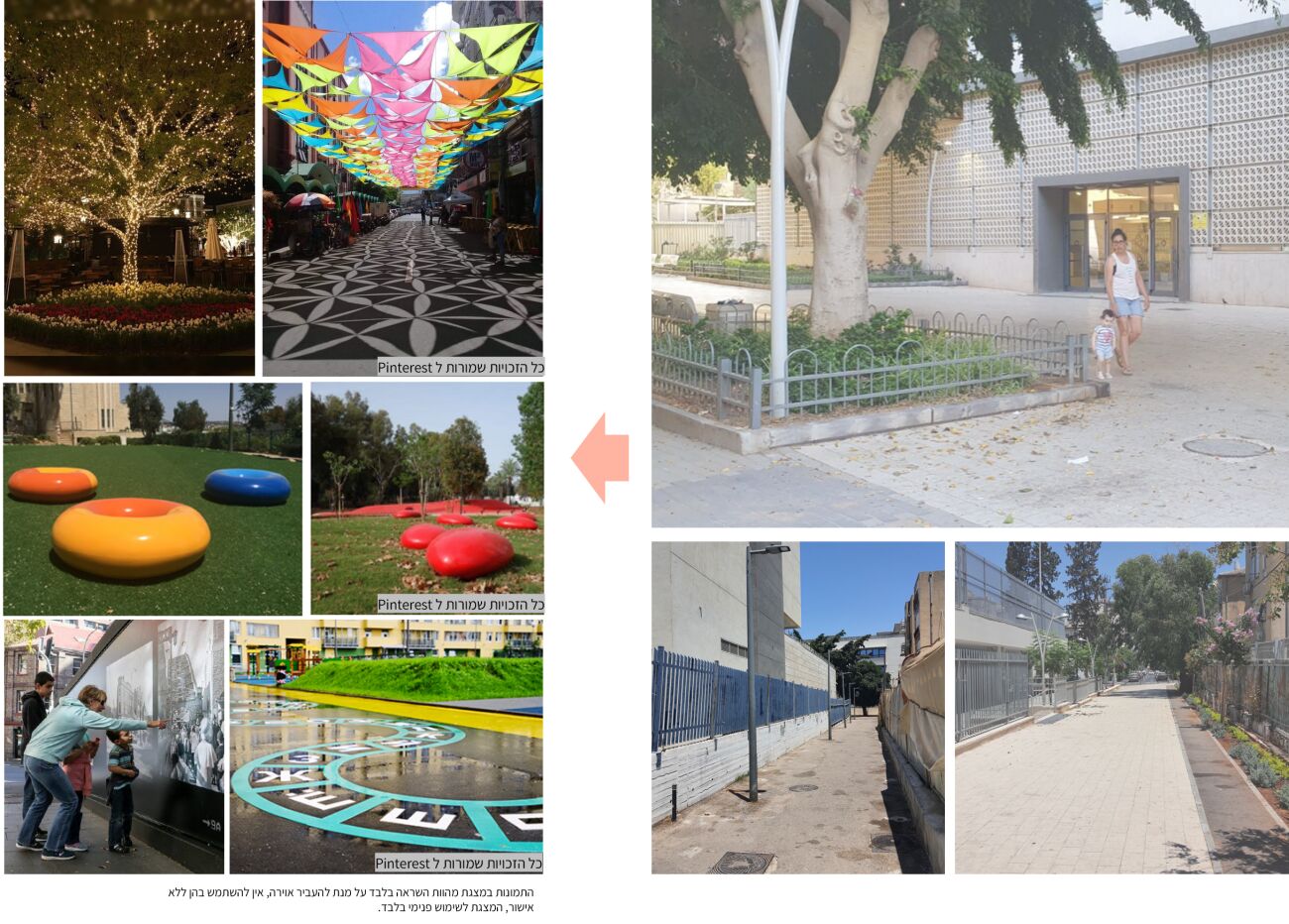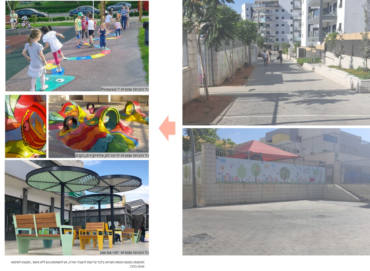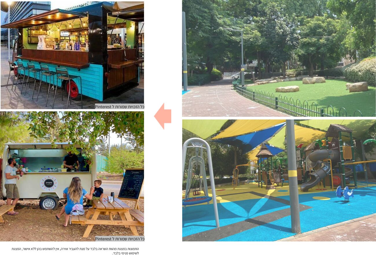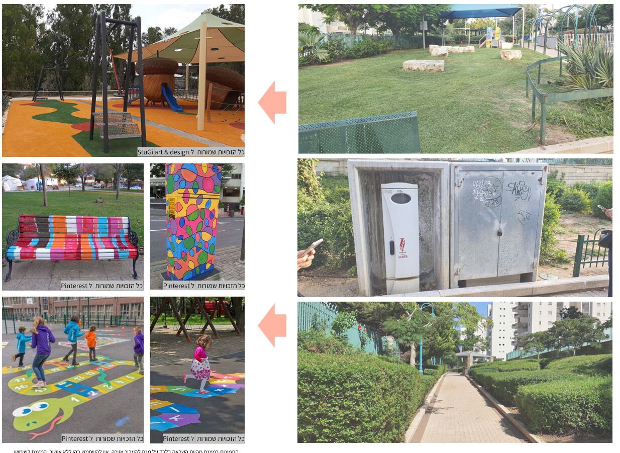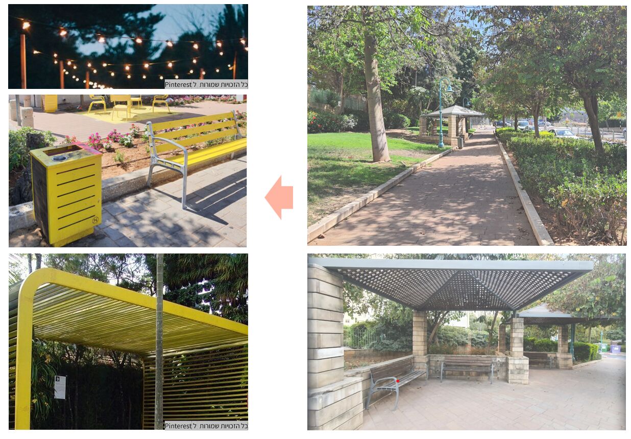 צביעת פרגולות קיימות ע"י אומן, הוספת תאורת אוירה, הוספת ריהוט רחוב וקולר