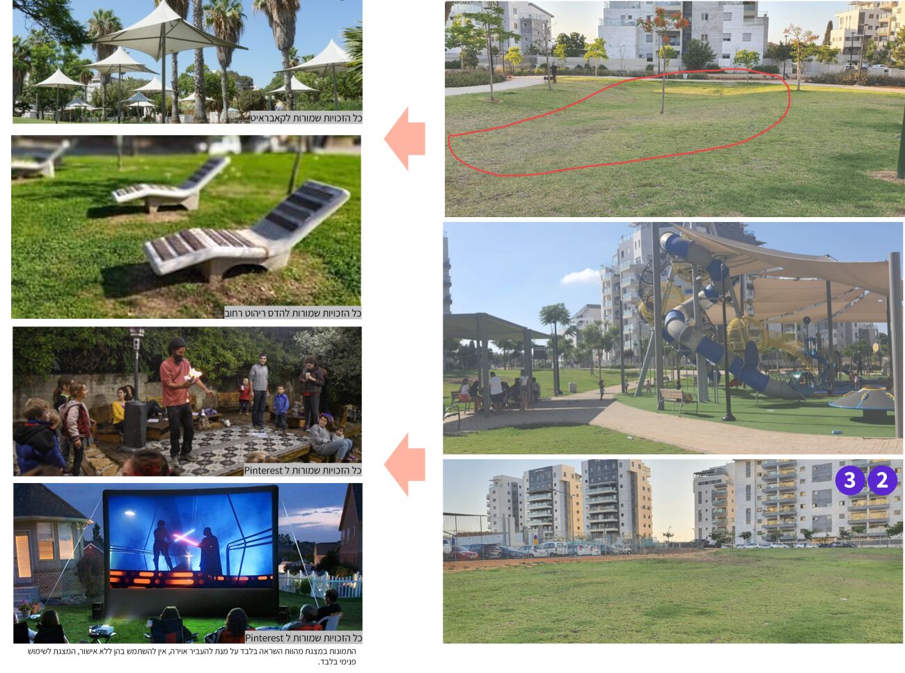 הוספת אדמה ושיקום מדשאה ומיתון שיפועים במדשאה (תלוי באישור ובדיקת ניקוז), הוספת שמשיות וריהוט רביצה בדשא, הקמת במה לאירועים, קניית מסך ומקרן לאירועים (לאישור) והצבת עמודון שקעים לאירועים (לאישור)