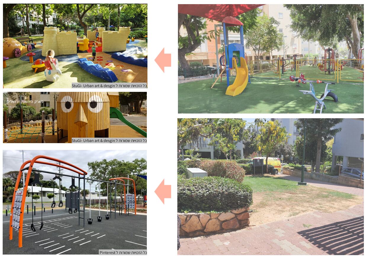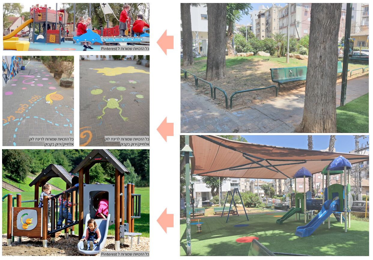הוספת גרפיקה על גבי רצפת הגן, הוספת שולחן יומולדת מעוצב, הוספת פרגולה על גבי הספסל, חיפוי גומות עצים בדק, החלפת מתקן קפיץ, שדרוג גינון, הארת 2 עצים בתאורה דקורטיבית