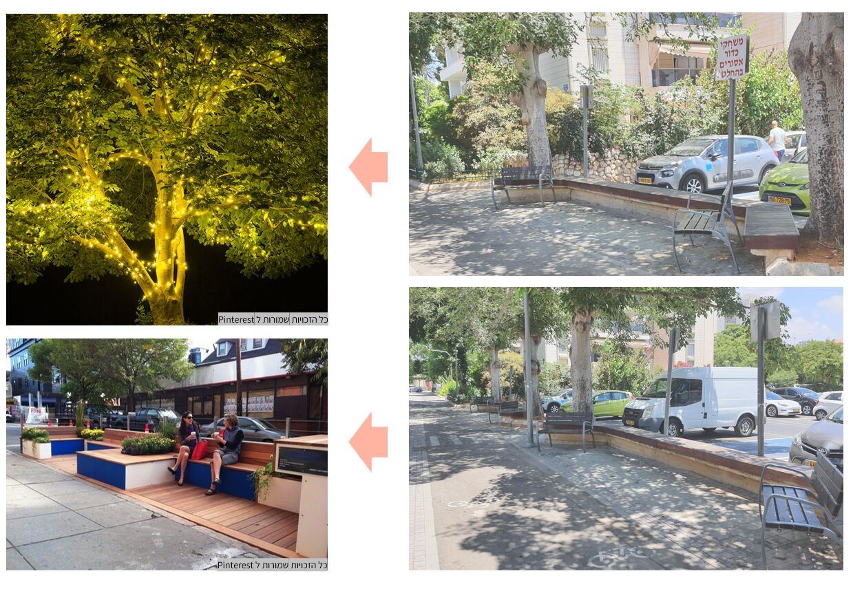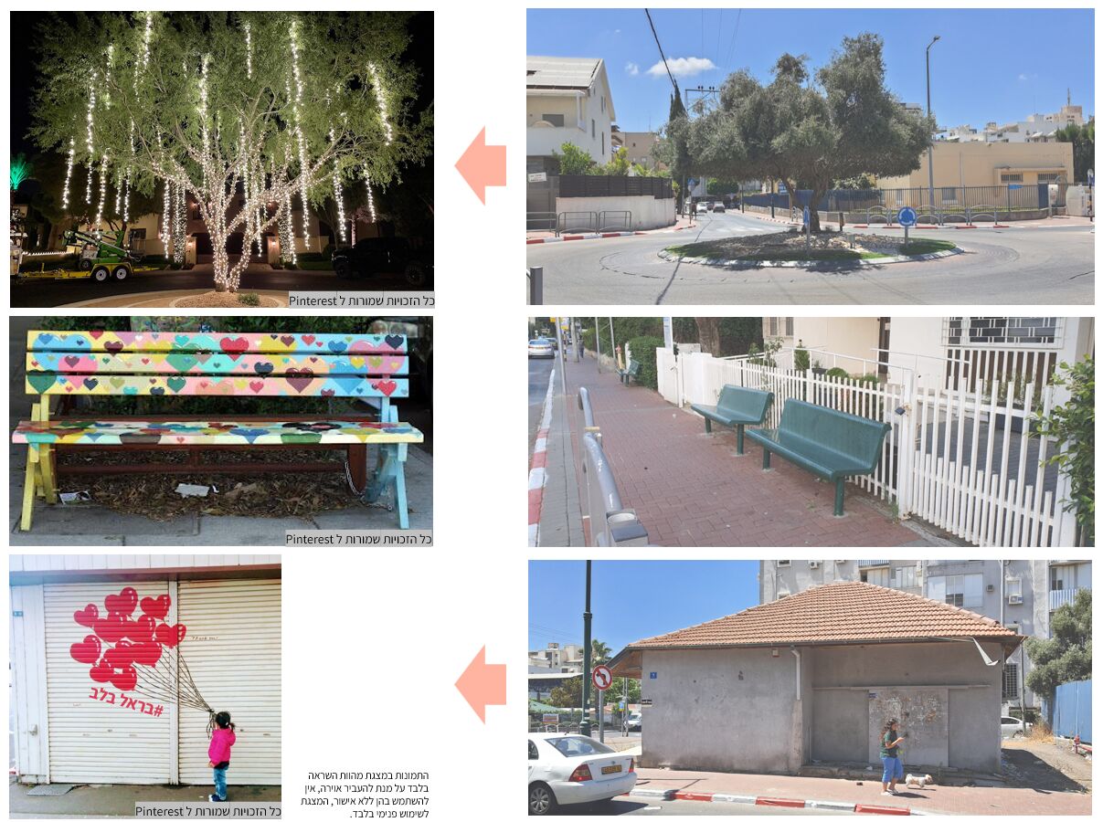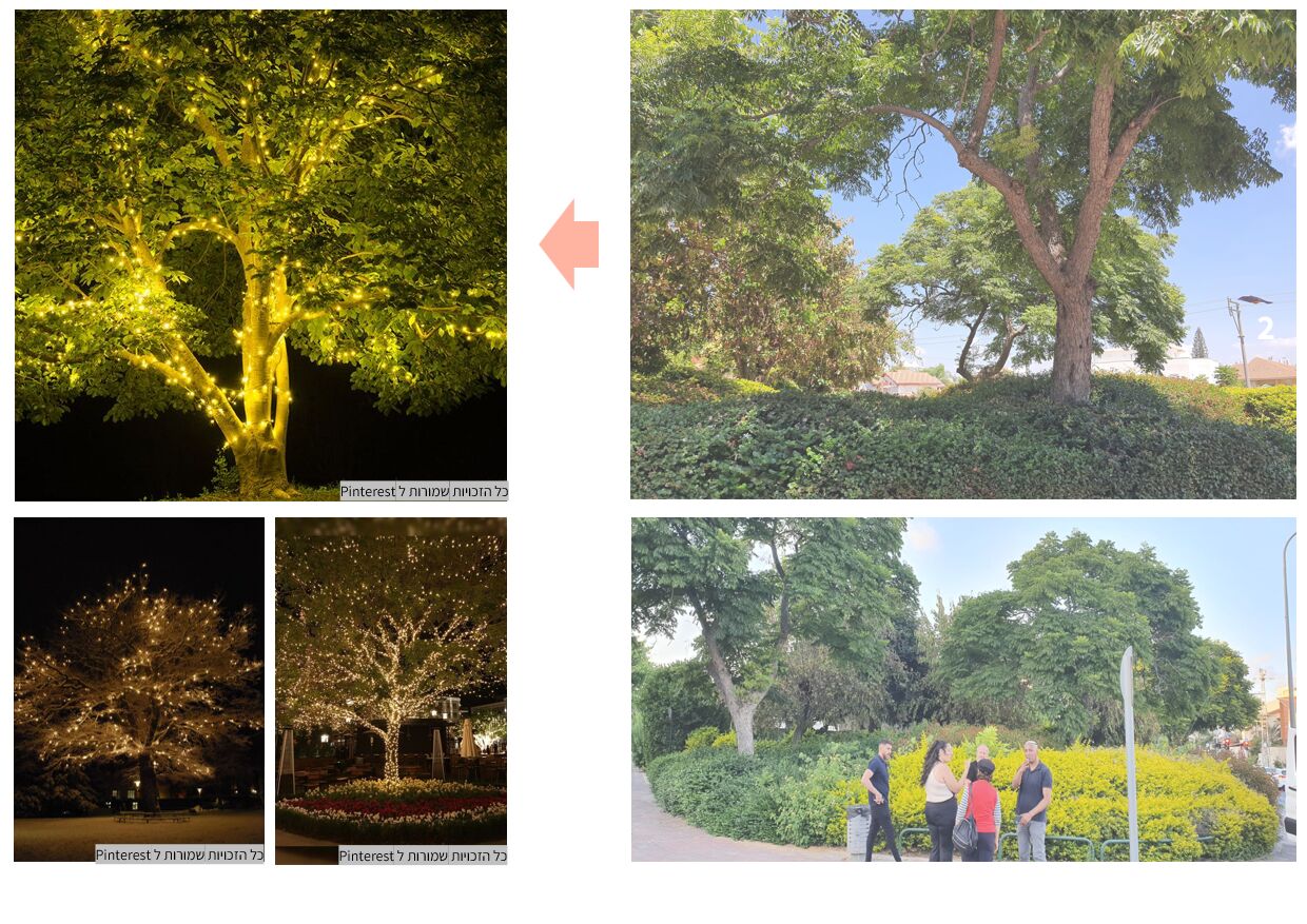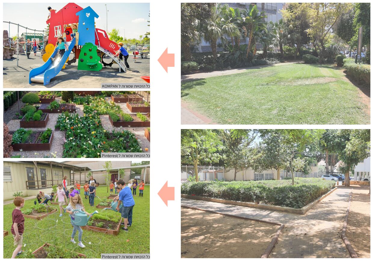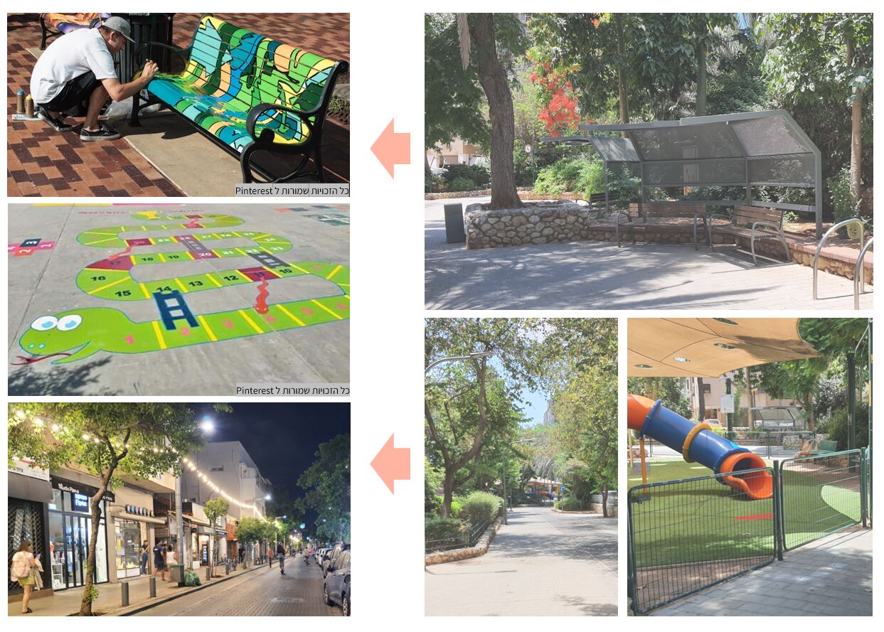 צביעת פרגולות קיימות , הוספת גרפיקה על הרצפה, החלפת ברזיה בקולר, ביטול גדרות מיותרות, הוספת שילוט צמחיה , צביעת ספסלים ע"י אומן, הוספת תאורת אוירה בגרילנדות