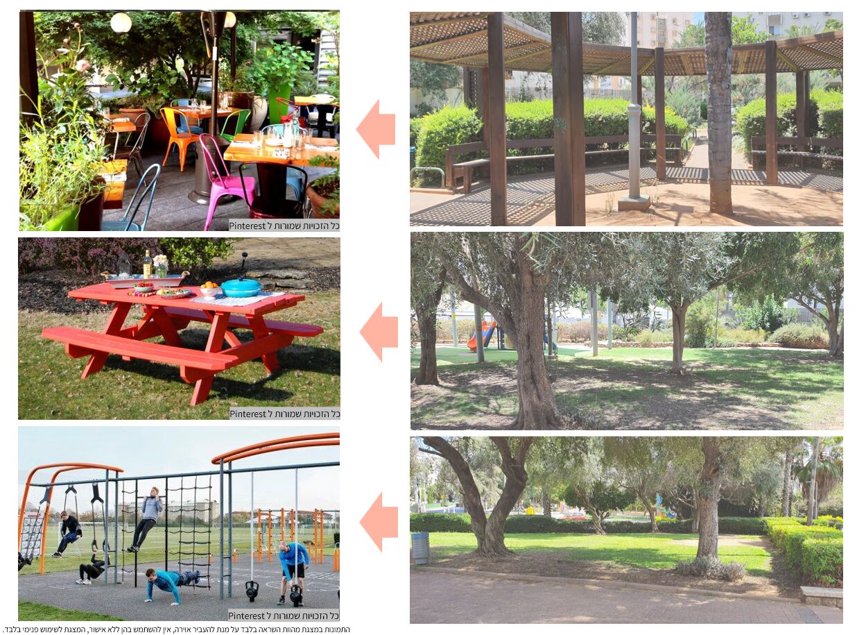 צביעת פרגולות קיימות, העתקת עץ דקל והשלמת ריצוף, הוספת תאורה, הוספת ריהוט ישיבה - שולחנות וכסאות . הוספת שולחנות פיקניק בדשא, הקמת גינת מתקני כושר פונקציונלי כולל הצללה, שדרוג גינון, הוספת קולר.