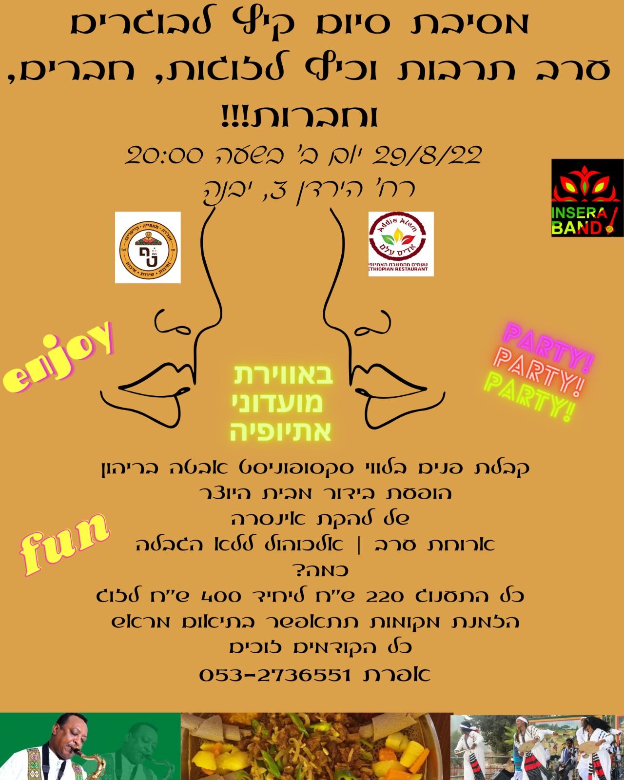המסעדה האתיופית בהנהלת אפרת "אדיס עלם" עם אוכל קולינרי משובח תקיים ביום שני 29/8/22 בשעה 20:00 מסיבת סיום הקיץ באווירת המועדונים באתיופיה, הכוללת קבלת קהל עם הסקסופוניסט אבטה בריהון הופעת בידור של להקת אינסרה, ארוחת ערב מפוארת על בסיס המטבח האתיופי ובר אלכוהול ללא תחתית .