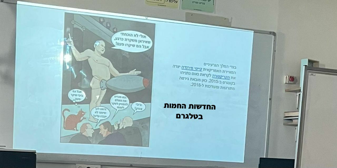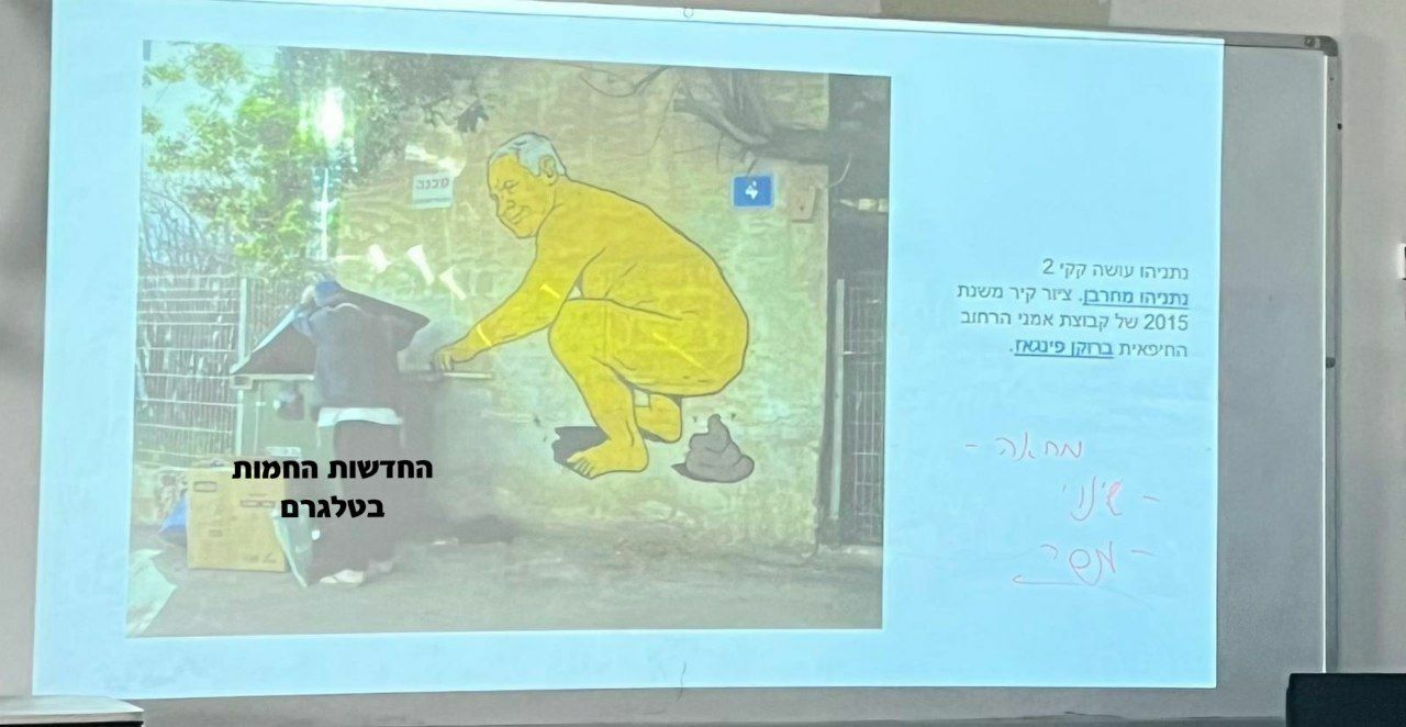 ואיך ניתן להסביר את השיעור של מורה מאשקלון אשר בחרה להציג בפני התלמידים בכיתה שורת קריקטורות פוגעניות נגד ראש הממשלה המציגה את ביבי עירום כביום היוולדו "ומחרבן" ברחוב או ביבי ערום ואבר מינו הוא טיל ועוד קריקטורות פוגעניות נגד ביבי.