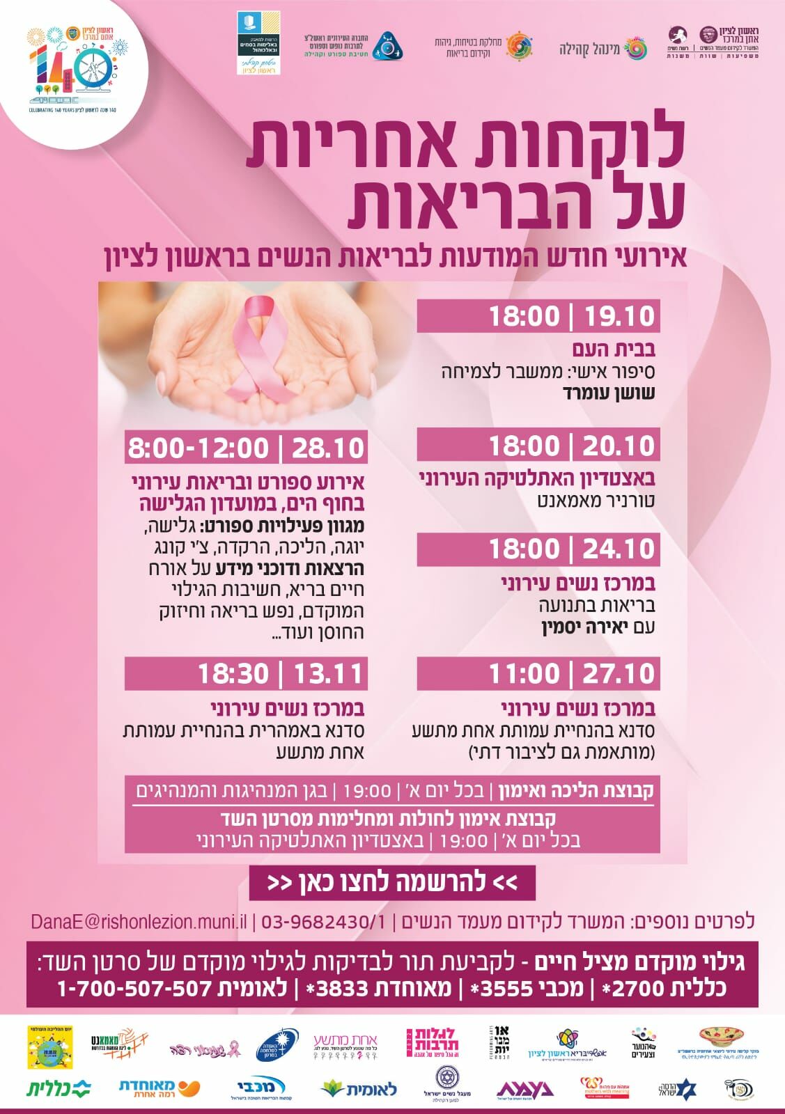 החל ממחר (רביעי 19.10) יפתחו בראשון לציון אירועי חודש המודעות לסרטן השד עם הרצאות, הפנינג בריאות עירוני, הטורניר המסורתי של מאמנט ועוד