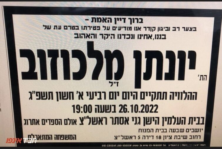 המשפחה יושבת שבעה בבית המנוח, רחוב שיבת ציון 18, דירה 5, ראשל"צ.