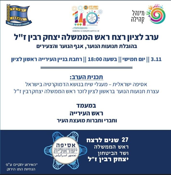 הערב (חמישי 3.11) יתקיימו בעיריית ראשון לציון מעגלי שיח בהשתתפות תנועות הנוער לציון 27 שנה לרצח רבין