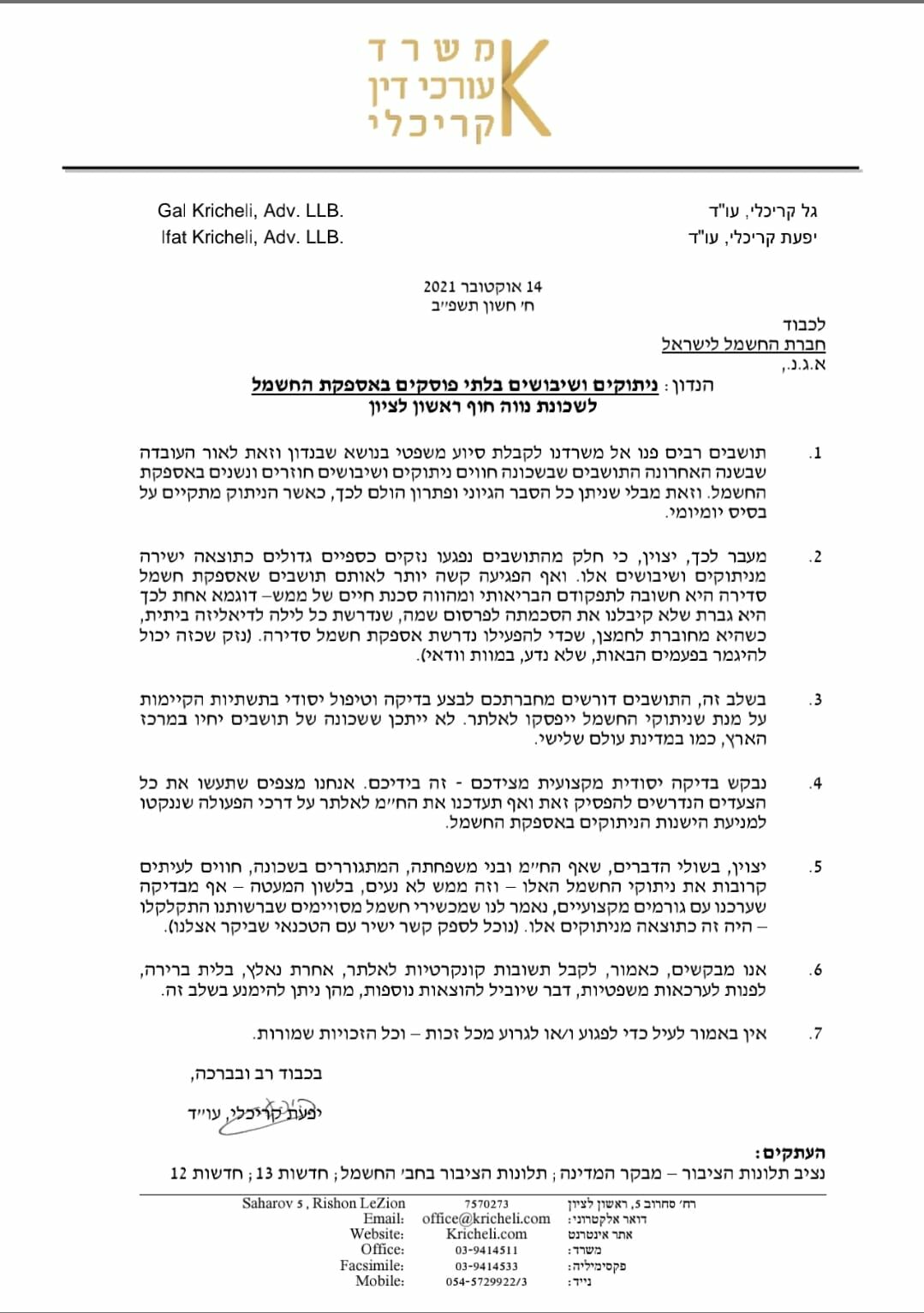 לאור ריבוי הפסקות החשמל קלודין עוזרי קוראת לתושבי נווה חוף בראשון לציון לנטוש את חברת החשמל ולעבור לספקיות החשמל המתחרות; בנוסף נשקלת תביעה משפטית לאור הנזקים הנגרמים לתושבים