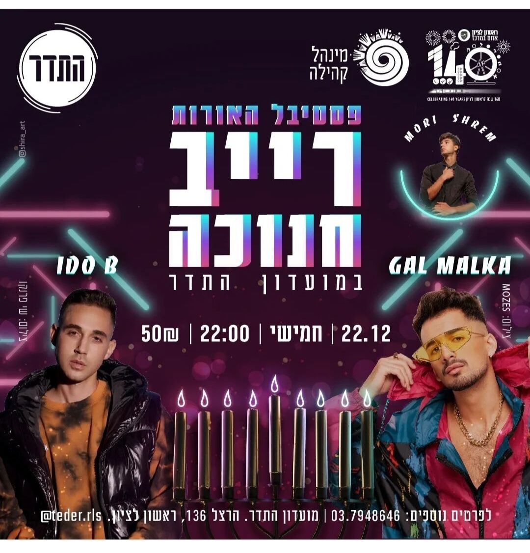 במהלך חג החנוכה רביעי וחמישי 21-22.12 יתקיים פסטיבל האורות במועדון התדר ראשון לציון בני הנוער יהנו ממסיבת רייב, דוכני משחק, מציאות מדומה ועוד הפתעות