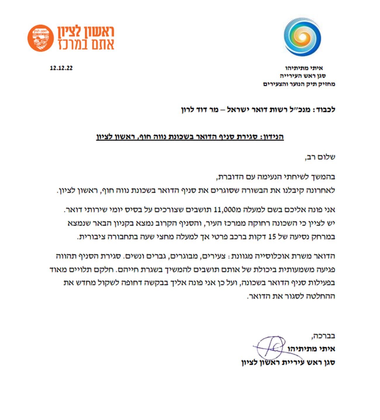 איתי מתיתיהו פנה למנכ"ל רשות הדואר לשקול מחדש את סגירת סניף הדואר בשכונת נווה חוף ראשון לציון