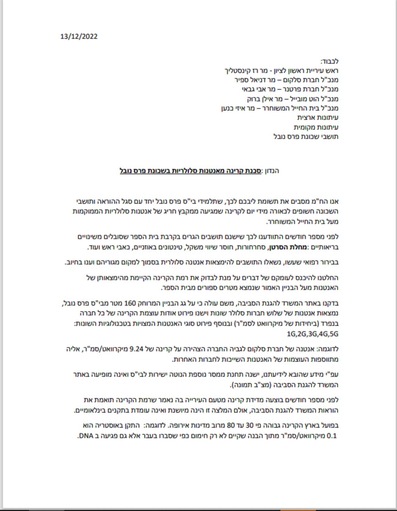 המכתב שנשלח לראש העיר, רז קינסטליך ומנכ"לי חברות הסלולאר