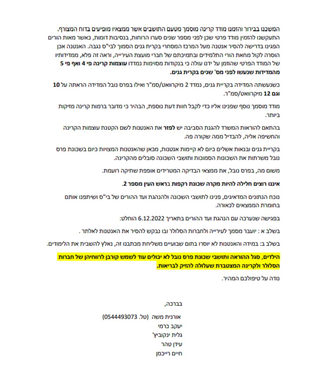 איום שביתה! תושבי פרס נובל והנהגת ההורים של בית הספר בשכונה מאיימים להשבית את הלימודים אם לא יוסרו האנטנות הסלולאריות הנמצאות על בית החייל המשוחרר