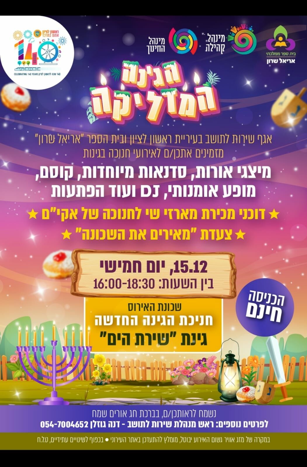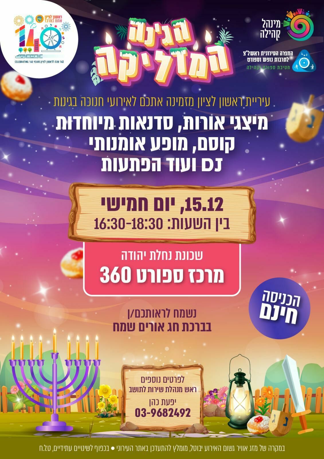 החל ממחר (חמישי 14.12) יפתחו בראשון לציון אירועי חנוכה בשכונות- גינה מדליקה ובמתנ"סים- מאירים את העיר, שיתקיימו בכל יום בשכונה אחרת. מחר יפתחו החגיגות בשכונות נחלת יהודה והאירוס עם מיצגי אורות, קוסם, סדנאות, מוזיקה ועוד הפתעות. בנוסף תתקיים חגיגת חנוכה במרכז קהילתי רוזן עם מופע של הילה הכל יכולה