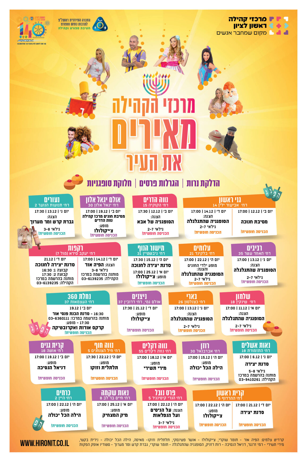 החל ממחר (חמישי 15.12) יפתחו אירועי חנוכה בראשון לציון עם מיצגי אורות, הופעת קוסם, מופע של הילה הכל יכולה ועוד הפתעות בשכונות נחלת יהודה, האירוס ובמתנ"ס רוזן