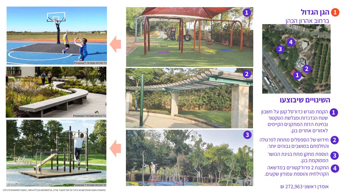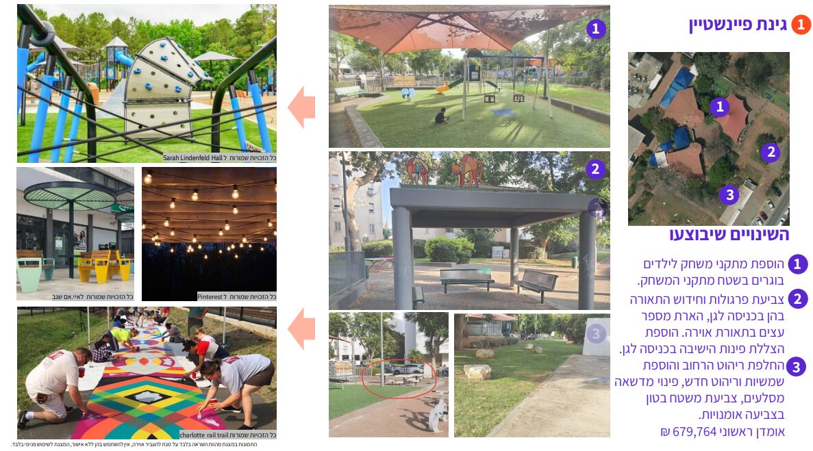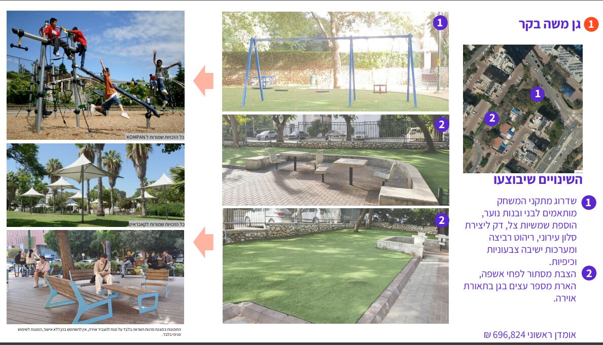 1. שדרוג מתקני המשחק בהתאמה לבני ובנות נוער, הוספת שמשיות צל ודק ליצירת סלון עירוני.