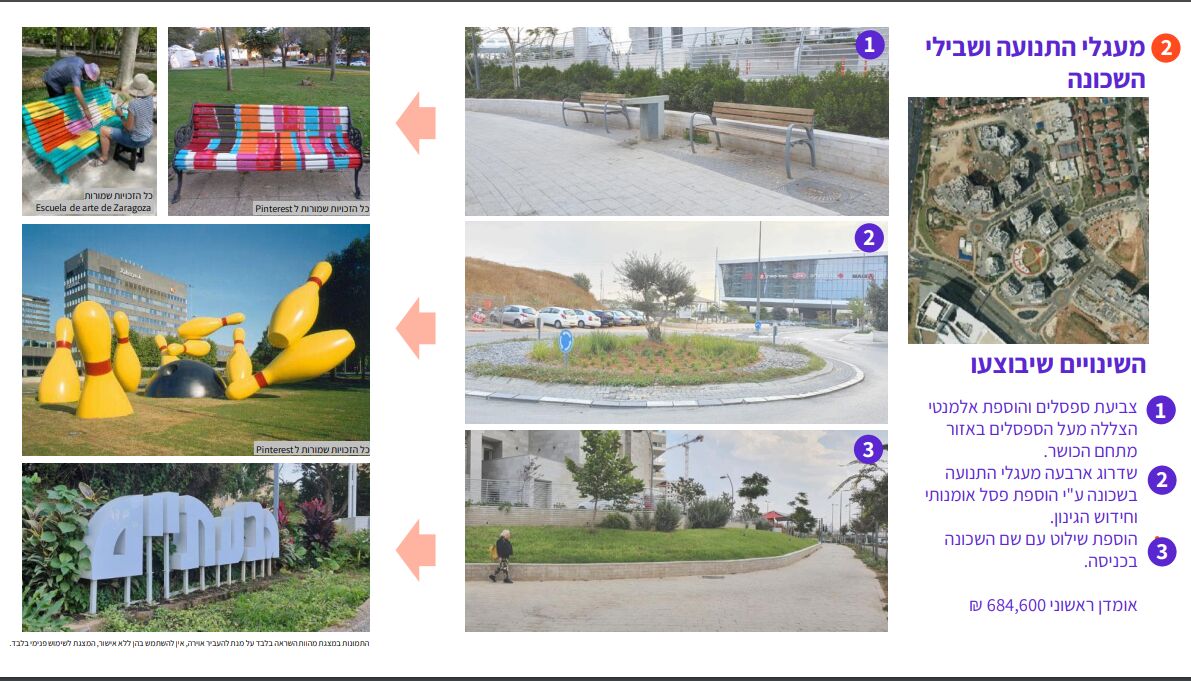 2. שדרוג ארבעת מעגלי התנועה בשכונה ע"י הוספת פסל אומנותי וחידוש הגינון.