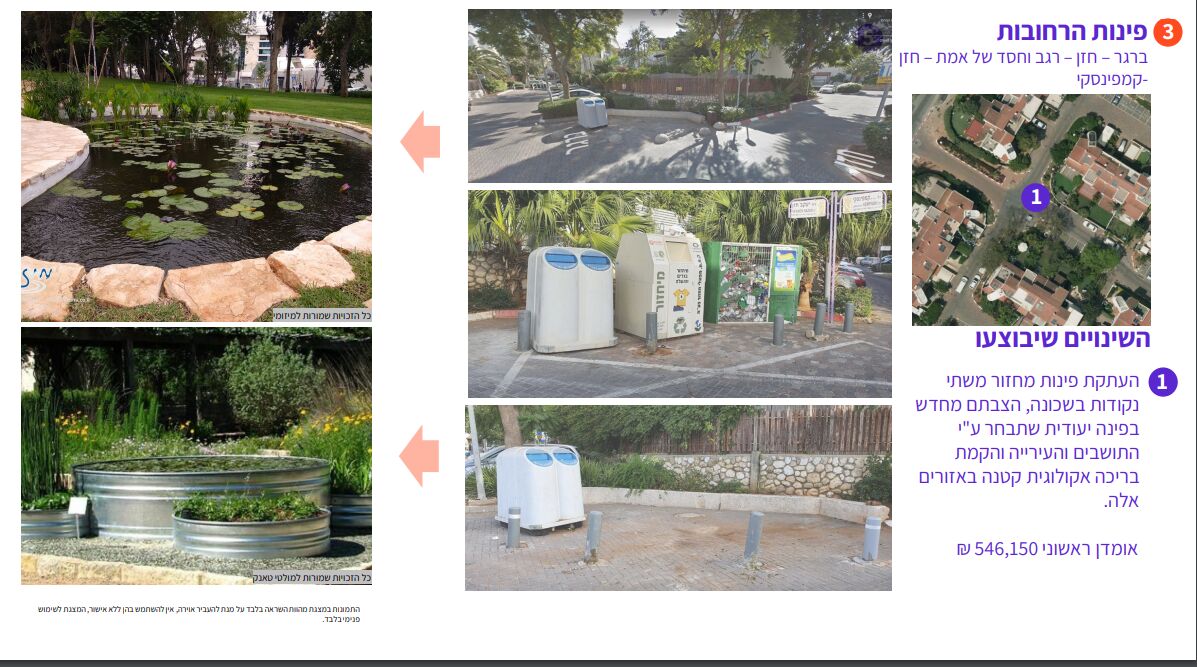 העתקת פינות מחזור משתי נקודות בשכונה והצבתם מחדש בפינה ייעודית שתבחר ע"י התושבים והעירייה. הקמת בריכה אקולוגית קטנה באזורים אלה.