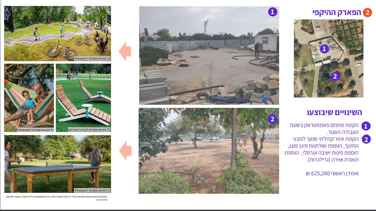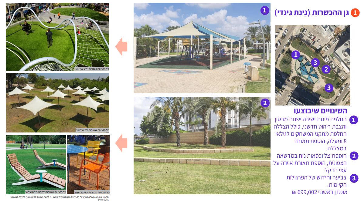 1. החלפת פינות ישיבה ישנות מבטון והצבת ריהוט חדשני כולל הצללה, החלפת מתקני המשחקים לגילאי 8 ומעלה, הוספת תאורה במצללה.