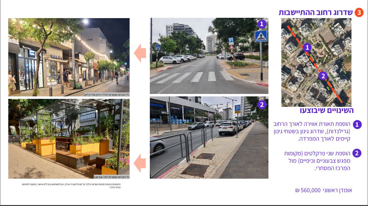 1. הוספת תאורת אווירה לאורך הרחוב (גרילנדות), שדרוג גינון בשטחי גינון קיימים לאורך המפרדה.
